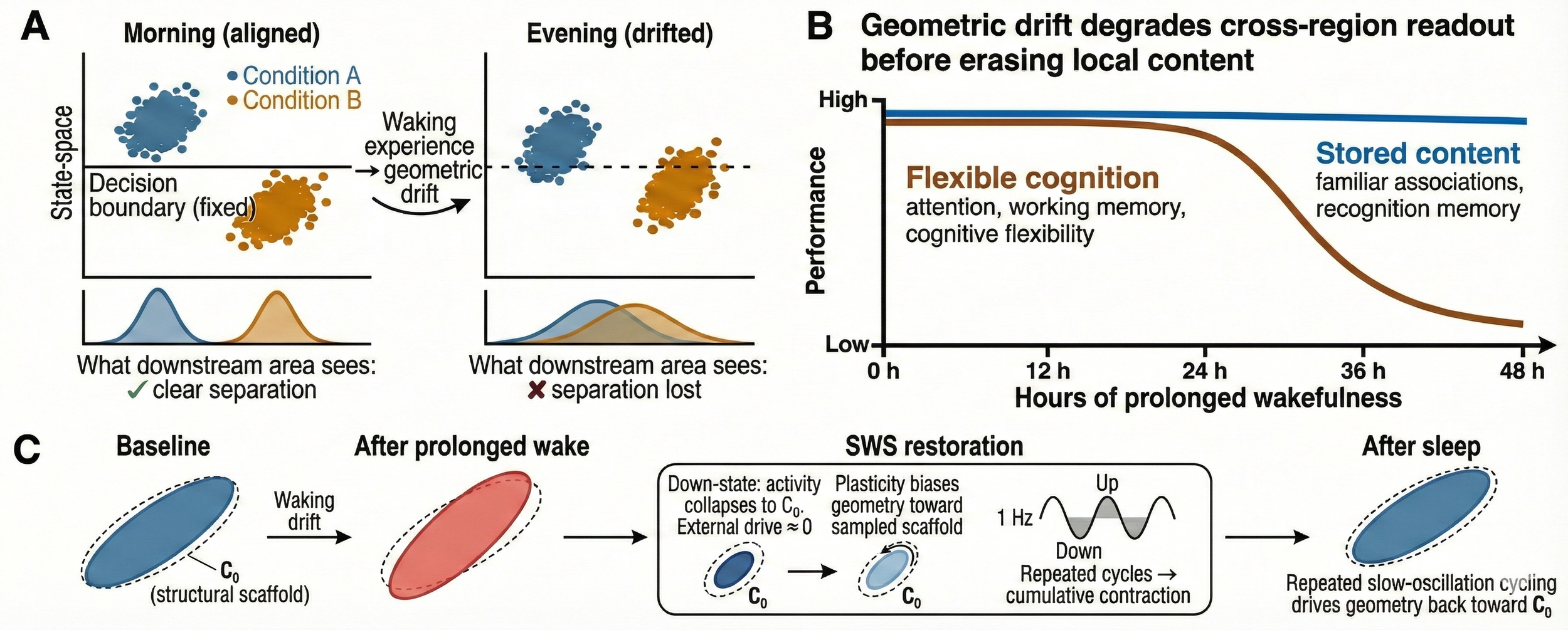 Figure 1 | Wake-induced geometric drift reduces population-geometry portability, and NREM/SWS restores alignment toward a structural scaffold. (a) Conceptual schematic of population activity in a low-dimensional “state-space” for two conditions (A, B). In the morning (aligned), a fixed downstream readout (decision boundary) cleanly separates conditions; the corresponding 1D projections (bottom) show minimal overlap. Across waking experience, representations can drift (e.g., rotate/shear the task-relevant subspace), such that within-session decodability may remain high but a largely fixed downstream readout becomes progressively mismatched, yielding lost separation in the evening (drifted). (b) Behavioral dissociation during prolonged wakefulness: performance in flexible cognition (attention, working memory, cognitive flexibility) declines earlier/steeper than performance supported by stored content (familiar associations, recognition memory). This is interpreted as geometric drift degrading cross-region readout before erasing locally decodable content. (c) Hypothesized mechanism for portability restoration. Baseline population geometry is biased toward a scaffold-preferred covariance/subspace, C₀ (“structural scaffold”). Wake-induced drift perturbs geometry away from this basin; repeated slow-oscillation down–up cycling during NREM slow-wave sleep (SWS) provides low-input epochs that preferentially sample scaffold-dominated dynamics and is hypothesized to drive a contraction back toward C₀, partially restoring cross-session decoder transfer and manifold alignment upon return to wakefulness. All panels are schematics. NREM, non–rapid eye movement; SWS, slow-wave sleep; C₀, scaffold-preferred covariance/subspace.